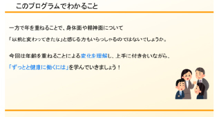 座学形式で、加齢による心身の変化の特徴と、健康維持・向上のために注意すべき点を