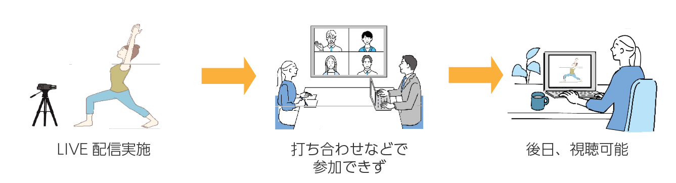 打ち合わせや商談や仕事でLIVEレッスンに参加できなかった従業員様にも、終了後も