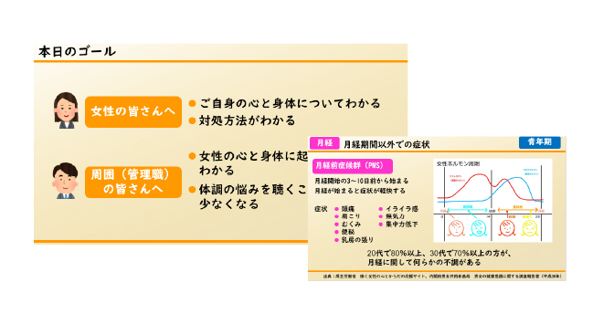 女性の身体の特徴を知り、不調予防や改善に取り組む意識を向上させ、仕事にもしっかり取り組めるような体制・認識基盤づくりを目指します。また、マネジメント層にとっては女性特有の不調やステージについての知識を得ることにより、よりよいマネジメントを目指します。