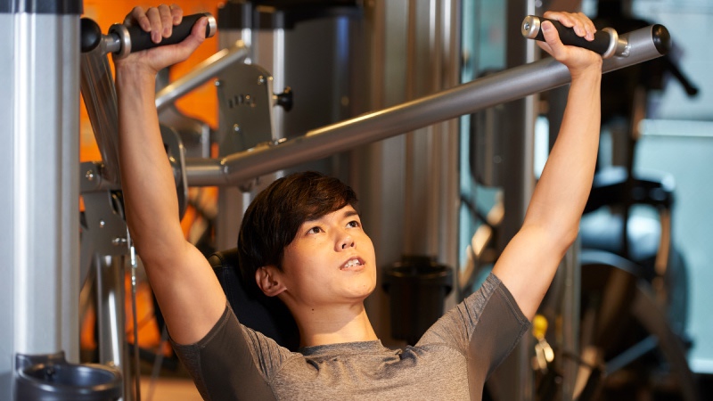 マシンでは、重量はもちろんですが、シートの高さやグリップの位置が合っていることが非常に重要です。それだけで、肩への効き方が変わります。